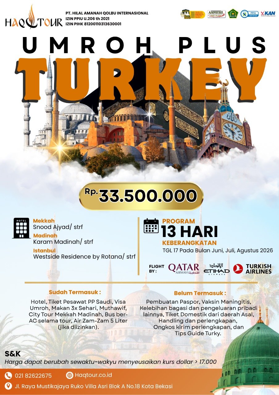 Nikmati perjalanan ibadah yang terencana melalui program spesial Umroh Plus Turkey 13 Hari bersama HAQTOUR. Dengan penawaran harga terbaik 33.5 Juta dan keberangkatan dijadwalkan setiap tanggal 17 bulan Juni, Juli dan Agustus 2026. Anda akan mendapatkan fasilitas terbaik dari Jakarta – Turkey – Jeddah dan difasilitasi dengan akomodasi hotel yang nyaman dan berkualitas selama di Turkey dan Tanah Suci. Kami menggunakan maskapai QR/EY/TK setaraf. Untuk pemesanan dan informasi lebih lanjut, silakan hubungi kontak resmi kami yang tertera.