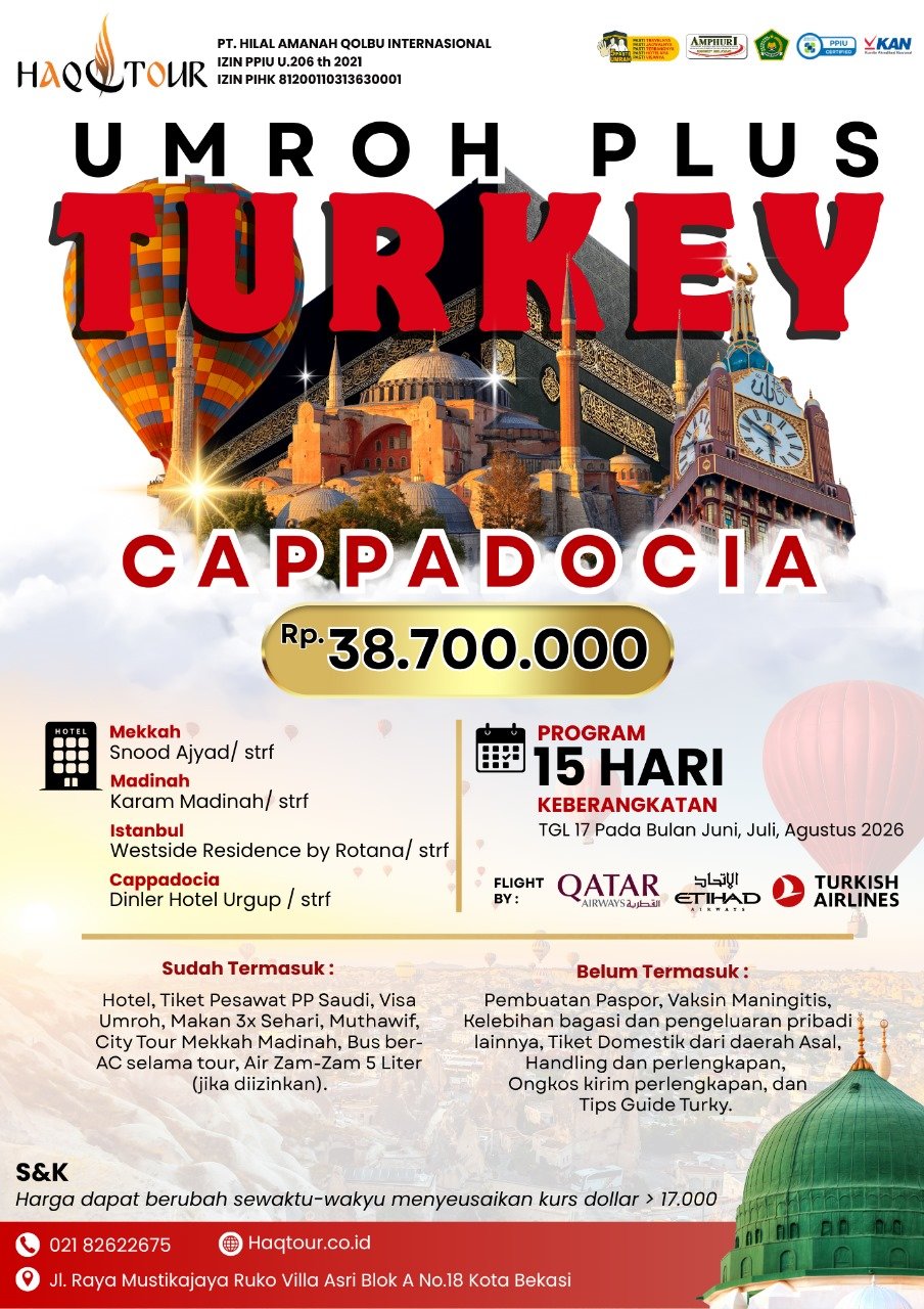 Nikmati perjalanan ibadah yang terencana melalui program spesial Umroh Plus Turkey Cappadocia 15 Hari bersama HAQTOUR. Anda akan mendapatkan fasilitas terbaik dari Jakarta – Turkey – Jeddah dan difasilitasi dengan akomodasi hotel yang nyaman dan berkualitas selama di Turkey, Cappadocia dan Tanah Suci. Kami menggunakan maskapai QR/EY/TK setaraf. Untuk pemesanan dan informasi lebih lanjut, silakan hubungi kontak resmi kami yang tertera.